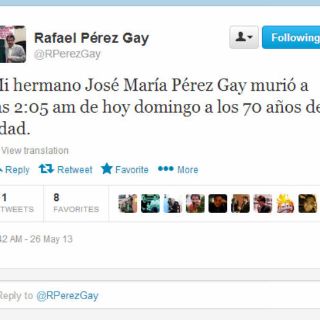 ''Mi hermano José María Pérez Gay murió a las 2:05 am de hoy domingo a los 70 años de edad".