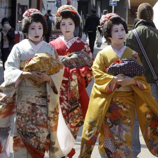 Enfundadas en sus largos kimonos, con sus rostros maquillados sobre una espesa base blanca, las geishas, o más bien "geikos", de la excapital imperial, caminan con elegancia por las calles adoquinadas del barrio de Gion, para asistir a sus citas en las casas de té.
