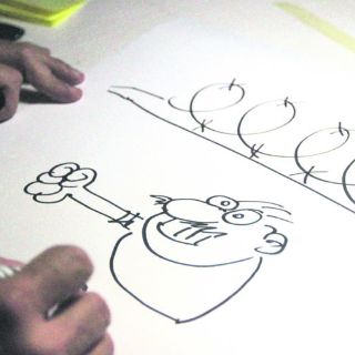 Aunque de principio el ambiente lució tranquilo y sumamente pendiente del desenvolvimiento del trovador y el monero, lo que destacó de inició fue el asombro ante la habilidad de Falcón, pues los asistentes argumentaban las facilidad con la que el cartonista manipulaba a placer el grueso marcador, pues al instante el papel presentó unas curvas a forma de espiral con algunas púas que daban oportunidad de ir imaginando la obra que el experto del trazo finalizaría.