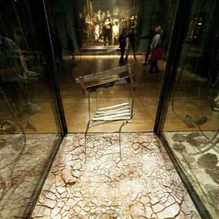 En las vitrinas laterales se ven, sobre un suelo de barro agrietado, varios girasoles negros boca abajo, elaborados con plástico, mientras que en la vitrina central hay una silla de café algo destartalada que difiere, según el propio autor, de la robusta silla sobre la que se sienta la mujer en el cuadro de Van Gogh.
