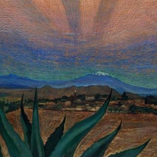 La pieza de mediano formato de Dr. Atl muestra en un primer plano una planta de maguey en un desierto, y en un segundo plano montañas y volcanes.