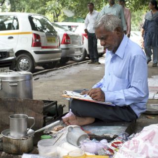 NUEVA DELHI, INDIA (23/AGO/2012).- Laxman Rao despacha té sentado a ras de suelo en una calle de Nueva Delhi, donde aprovecha para vender también sus obras literarias, que han contado con admiradores tan ilustres como la asesinada primera ministra Indira Gandhi.