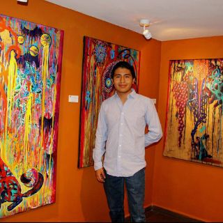 "Es mi primera vez en Miami, apenas estoy empezando a salir", confesó con voz tenue el joven de piel morena, y ojos negros brillantes, durante el encuentro en la galería Elementi, en donde expuso dos de sus cuadros de 2.50 por dos metros.