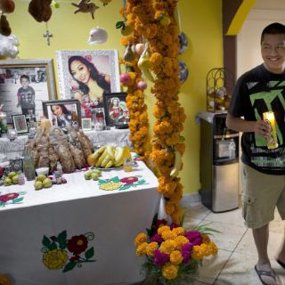 Los altares son decorados con fotografías de seres queridos fallecidos, calaveras de azúcar, frutas, velas, flores y pan, tal como se acostumbra en México.