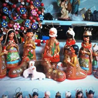 Hasta el final, otra mujer cuida otro puesto de nacimientos, "estos tienen ojo de vidrio y su pestaña", responde cuando se le pregunta cuál de los que vende es el que recomienda, "no va a encontrar mejores hechos que los de aquí", dice y señala uno grande de barro, de doce piezas, con acabados dorados.