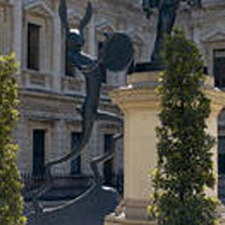 El escocés David Mach, conocido por su utilización de "objetos encontrados", desde periódicos o cerillas hasta neumáticos en sus obras ha creado esta vez con perchas metálicas una enorme y amenazante escultura de gorila golpeándose el pecho como el del filme King Kong.