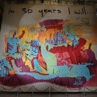 Las notas de colores que ayudan a recordar a los más olvidadizos han servido para confeccionar la enorme cartelera que muestra dos grandes figuras bajo el lema "En treinta años estaré..." .