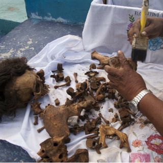 Cada año, los huesos de cientos de cadáveres son limpiados uno a uno para después reposarlos en una caja cubierta por servilletas bordadas a mano con diseños coloridos, y acompañarlos con velas y flores.