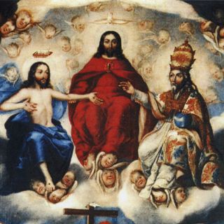 La Trinidad es un tema que se ha abordado desde la Edad Media debido a que “contiene partes muy importantes del credo católico y ha sido representada de dos formas: la clásica, donde el Espíritu Santo es una paloma blanca, y la antropomorfa, donde el Espíritu Santo aparece como un hombre joven vestido con una túnica roja. Esta última iconografía fue muy popular en el siglo XVIII, sobre todo en la Nueva España”, comenta el autor.
