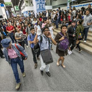 La gente de seguridad de la feria los va acompañando, atentos al fluir de la gente que quiere atestiguar esa manifestación civil que la noche de ayer tomó por unos minutos el encuentro literario, que insistió en exigir justicia y que hace un llamado a la sociedad con la certeza de que uno de los 43 normalistas desaparecidos bien podría haber sido uno de ellos.
