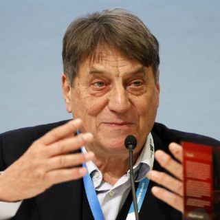 Claudio Magris entra al salón. El silencio se impone. Pero luego su presencia es aplaudida. Viste un saco oscuro, un suéter oscuro y una camisa azul cielo.