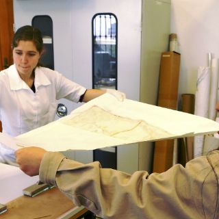 Las restauradoras Verónica Kuhliger y Laura García se encargaron de la intervención del paño, así como de su investigación histórica que arrojó datos en torno a la muerte del conquistador, en 1547.