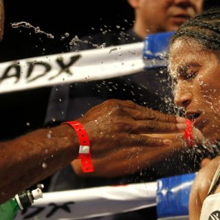 La imagen de Núñez Cortés muestra a una boxeadora latina que está sentada en una de las esquinas del ring en un momento de descanso en un combate. A detalle puede admirarse cómo su manager lanza agua de forma directa al rostro de la mujer, haciendo la alusión de un bautizo.