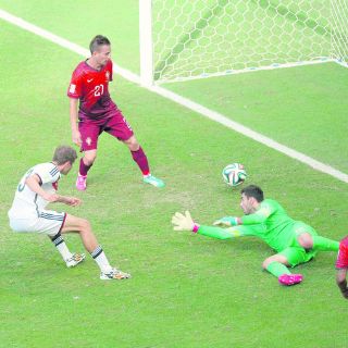 Alemania no acusó los golpes y, siempre con la pelota como mejor aliada, empezó a adueñarse del partido. Khedira lanzó desviado un tiro desde fuera del área tras un despeje defectuoso de Rui Patricio (9) que no entró por milímetros y, segundos después, Joao Pereira cometió penal sobre Mario Gotze por un agarrón cuando éste ya se preparaba para romper las mallas de la portería portuguesa. Thomas Müller no erró.