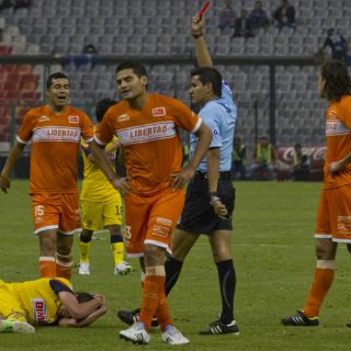 El árbitro Miguel Angel Chacón amonestó a Juan de la Barrera al minuto 16 y lo expulsó de roja directa al 25.