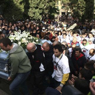 El féretro de "Supersic", como se conocía cariñosamente al piloto, estuvo escoltado por un grupo de jóvenes que vestían monos de motociclista y que portaban globos con el número 58 con el que corría el italiano.
