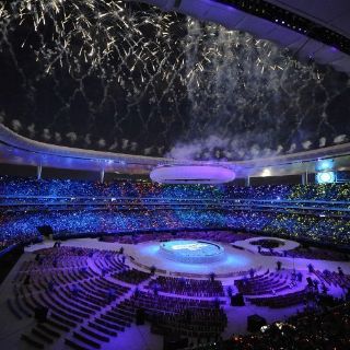 El Presidente Felipe Calderón, el mandamás del Comité Olímpico Internacional Jacques Rogge y figuras deportivas como el ex boxeador Julio César Chávez y el capitán de la selección mexicana de futbol Rafael Márquez asistieron al espectáculo en el Estadio Omnilife.