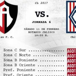 GUADALAJARA, JALISCO (11/FEB/2017).- El Atlas reporta a través de sus redes sociales que se han agotado todas las entradas para el Clásico Tapatío, por lo que insta a los aficionados a asistir al Estadio sólo si cuentan con boletos y a no fomentar la reventa.