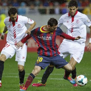 En el estadio Ramón Sánchez Pizjuán, el equipo "palangana" se puso al frente en el marcador 1-0 gracias al gol de Alberto Moreno a los 15 minutos tras una buena jugada de conjunto. Cinco minutos después, el colombiano Carlos Bacca remató al poste para fortuna del cuadro "culé".