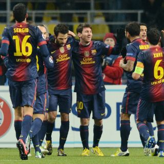 El técnico del equipo español, Tito Vilanova, apostó por vez primera en la Liga de Campeones por poner de inicio a "la troika de bajitos" -Xavi, Iniesta y Cesc-, acompañados por el reaparecido Busquets, que regresó tras su sanción.