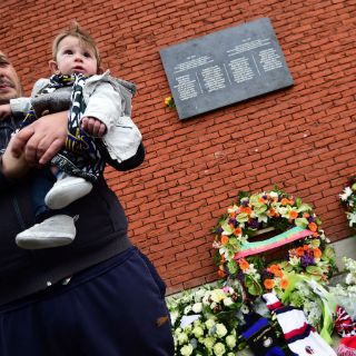 Con un soplo de corneta el viernes por la mañana, coronas de flores fueron colocadas sobre una placa de recuerdo en el estadio Rey Balduino, que fue renovado y renombrado después de la tragedia.