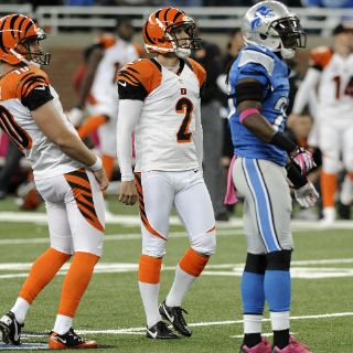 DETROIT, MICHIGAN (20/OCT/2013).- Mike Nugent convirtió un gol de campo de 54 yardas cuando el tiempo se agotaba, para llevar el domingo a los Bengalíes de Cincinnati a una victoria por 27-24 sobre los Leones de Detroit.