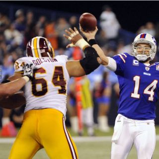 TORONTO, CANADA (30/OCT/2011).- Ryan Fitzpatrick lanzó el domingo dos pases de touchdown y la defensiva de los Bills tuvo nueve capturas de quarterback para vapulear 23-0 a los Pieles Rojas de Washington en la casa adoptiva de Buffalo en Canadá.