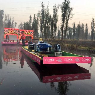 Sobre una trajinera en Xochimilco se exhibió el auto cuya velocidad puede superar los 200 kilómetros por hora.