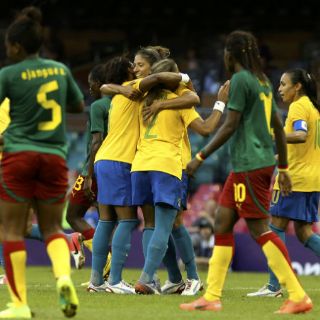 CARDIFF, GALES (25/JUL/2012).- La selección femenina de Brasil de fútbol resolvió su debut en Londres 2012 con un plácido y contundente triunfo ante la modesta Camerún (0-5) en partido disputado en un semivacío estadio del Milenio de Cardiff.