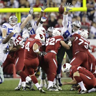 Arizona (5-10) estaba en graves problemas, pero el novato John Skelton, en cuarta oportunidad y 15 por avanzar lanzó un pase de 26 yardas al también novato Max Komar y los Cardenales avanzaron hasta quedar cerca del alcance de Feely. El pateador, quien acababa de anotar un gol de campo de 49 yardas, ha fallado tres intentos en la temporada, entre ellos uno de 49 yardas el sábado.