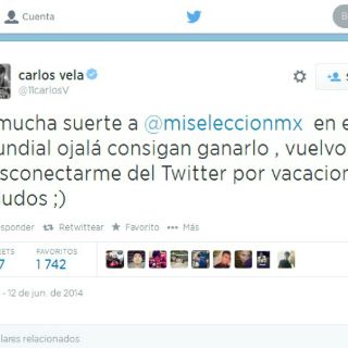 "Y mucha suerte a @miseleccionmx en el mundial ojalá consigan ganarlo , vuelvo a desconectarme del Twitter por vacaciones saludos ;)".