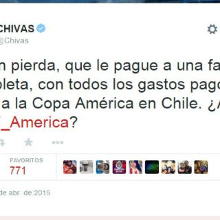 "Quien pierda, que le pague a una familia completa, con todos los gastos pagos (sic), un viaje a la Copa América en Chile. ¿Aceptas, @CF_America?".