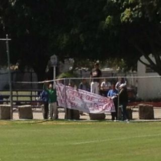 Minutos después de las 11 de la mañana, los aficionados se colocaron atrás de la portería sur, de la cancha Fausto Prieto. Comenzaron a colgar una manta que decía textual: Chivas es más importante que el cheque que cobran, si no lo entienden, lárguense.