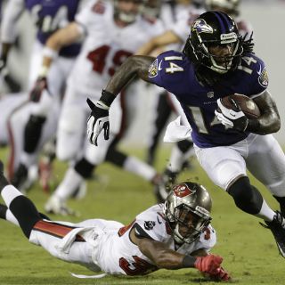 En Tampa, Joe Flacco se vio bien en su debut de pretemporada, el corredor de segundo año Bernard Pierce anotó en una escapada de 20 yardas y una renovada defensa de los Cuervos forzó cuatro entregas de balón para que Baltimore apaleara 44-16 a Tampa Bay.