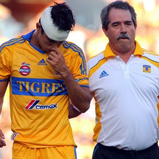 MONTERREY, NUEVO LEÓN (26/JUL/2010).- Aún con el vendaje que le fue colocado por el personal médico de Tigres, luego de un choque con el portero rival Carlos Bossio al minuto 7 de acción, Jesús Molina salió del vestidor al término del partido contra Querétaro para subirse a una ambulancia y ser suturado de la herida que sufrió en la cabeza.