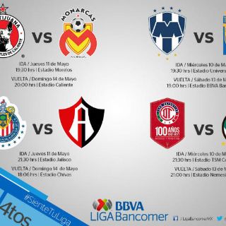 En tanto el Clásico Regio entre Rayados de Monterrey y Tigres de la UANL se realizará el miércoles 10 de mayo a las 19:30 en el Estadio Universitario, y el complemento el sábado 13 de mayo a las 19:00 en el Estadio BBVA Bancomer.