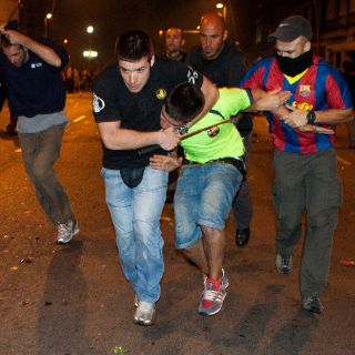 BARCELONA, ESPAÑA (29/MAY/2011).- Fuerzas de seguridad españolas detuvieron a más de 80 personas por desorden público y otras infracciones, mientras que unos 130 aficionados del futbol necesitaron asistencia médica, lo que enturbió las celebraciones por el cuarto título europeo del Barcelona.