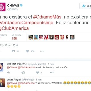 A través de la cuenta de Twitter @Chivas, se publicó el siguiente mensaje: "Si no existiera el #OdiameMás, no existiera el #VerdaderoCampeonísimo. Feliz centenario @ClubAmerica".
