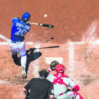 TORONTO, CANADÁ (15/JUN/2016).- Josh Donaldson pegó grand slam y remolcó cinco carreras, el dominicano Edwin Encarnación disparó jonrón de dos anotaciones y los Azulejos de Toronto aplastaron ayer 11-3 a los Filis de Filadelfia.
