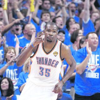 OKLAHOMA CITY, ESTADOS UNIDOS (13/JUN/2012).- Los Thunder de Oklahoma City con el alero Kevin Durant, que aportó 36 puntos, incluidos 17 en el cuarto periodo, ocho rebotes y cuatro asistencias, vencieron por 105-94 a los Heat de Miami en el primer partido de las Finales de la NBA que disputan al mejor de siete.
