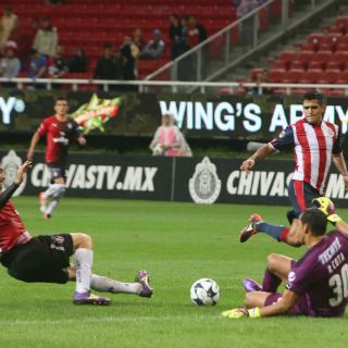 Guadalajara dominaba el partido, pero al minuto 41 Flavio Santos se metió al área en un saque de banda y metió disparo flojo a primer poste donde falla Cota al dejar libre un resquicio por donde pasa el balón para un inesperado empate rojinegro.
