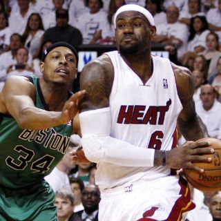 MIAMI, ESTADOS UNIDOS (29/MAY/2012).- LeBron James convirtió 32 puntos y capturó 13 rebotes, mientras Dwyane Wade anotó en el cuarto período 10 de sus 22 tantos y el Heat de Miami venció el lunes por 93-79 a los Celtics de Boston para pegar primero en la final de la Conferencia Este.