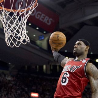 LeBron James anotó 30 puntos y Chris Bosh otros 28 en contra de su ex equipo y el Heat de Miami derrotó el domingo por 100-85 a Toronto, para sumar su décima victoria consecutiva contra los Raptors.