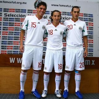 Los jugadores Andrés Guardado, del Deportivo La Coruña, Héctor Moreno, del AZ Alkmaar, y Jorge Torres Nilo, del Atlas, posaron para la prensa con esta camiseta de edición especial.
