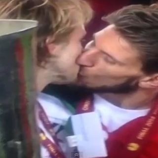 El croata Rakitic y el luso Carrico se dan un beso en la celebración de la Europa League