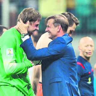 GUADALAJARA, JALISCO (07/JUL/2014).- La decisión la tomó Louis Van Gaal convencido por Frans Hoek (Hoorn, Holanda; 57 años), entrenador de porteros de la selección de Holanda. “Cuando nos fuimos a la prórroga, comencé a sentir un hormigueo porque pensé que podía salir, fue increíble”, reconoció después el meta Tim Krul, héroe de la tanda de penaltis ante Costa Rica, toda vez que salió en el último minuto de la prórroga y detuvo dos penas máximas además de adivinar la dirección de los cinco golpeos. No fue, sin embargo, casualidad.