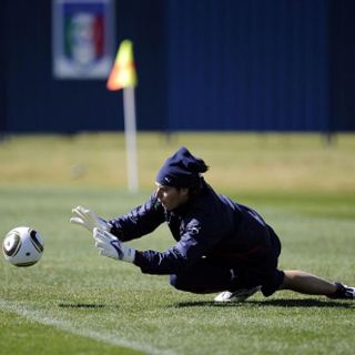 IRENE, SUDÁFRICA (16/JUN/2010).- El arquero italiano Gianluigi Buffon padece una hernia intervertebral que pone en peligro su continuación en el Mundial.