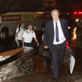 RECIFE, BRASIL (12/JUN/2013).- La selección española de futbol llegó a la ciudad brasileña de Recife, donde jugará el domingo su primer partido por la Copa Confederaciones, en medio de una fuerte lluvia que no apagó el calor y la euforia de una centena de aficionados que esperaban a la Furia a la entrada del hotel.