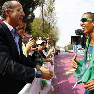 A su llegada, el mandatario asistió a la prueba de maratón varonil, en la cual felicitó al ganador brasileño Solonei Siva.