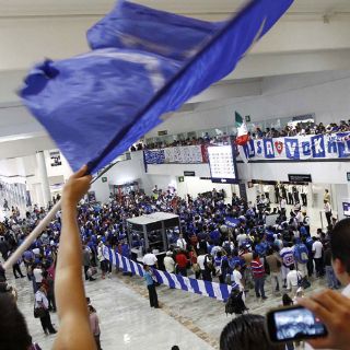 Ataviados en su mayoría con playeras celestes, los aficionados del conjunto cementero, que la víspera conquistó por tercera vez en su historia el torneo de Copa, no cesaron de gritar "Azul, azul, azul" y otros gritos de batalla, mientras esperaban la llegada del vuelo procedente de Cancún, donde el equipo entrenó esta mañana.